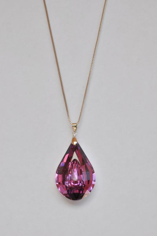 Na řetízku stříbrné barvy, je zavěšena krásná fialová kapka velká 4,5 cm, je průhledná, jen podklad stříbrný. Řetízek je dlouhý asi 40 cm, jeho délku si můžete trochu upravit. Velká slza či kapka vynikne ve vašem výstřihu.
